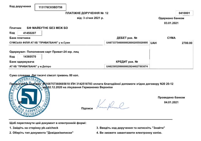 03.01.2021 | Благодійна допомога для Германенко Віроніки | 2700,00 грн. | Квитанція |