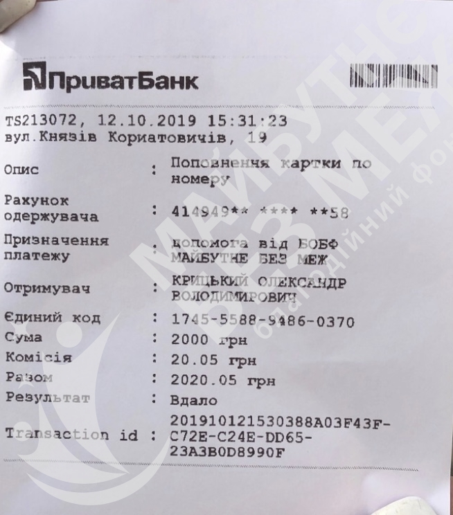 Незважаючи на те, що Благодійний Фонд займається допомогою в першу чергу діткам, Координаційна Рада фонду вирішила допомогти і надала допомогу у сумі 2000 (дві тисячі) грн