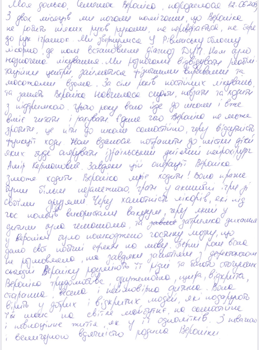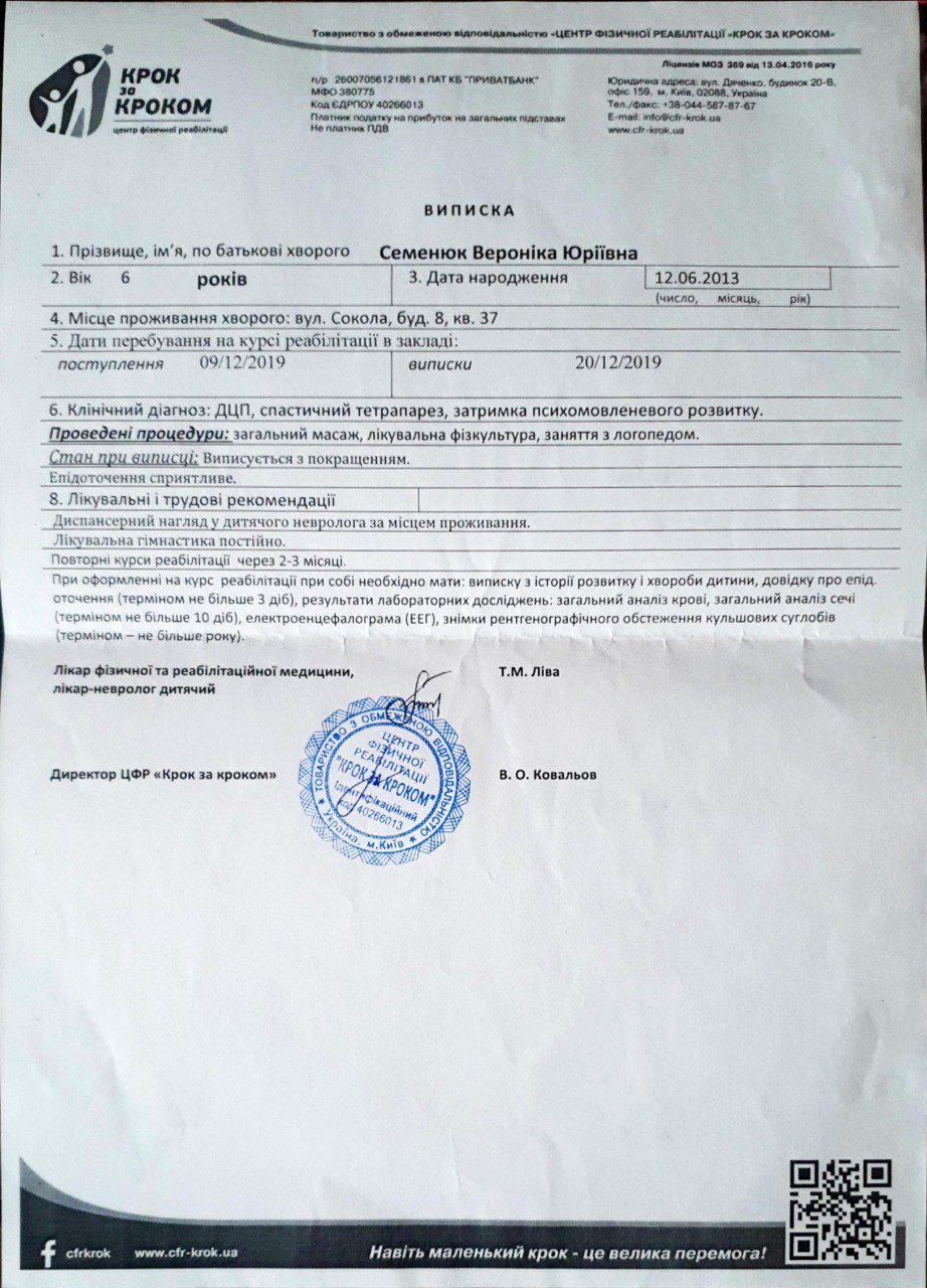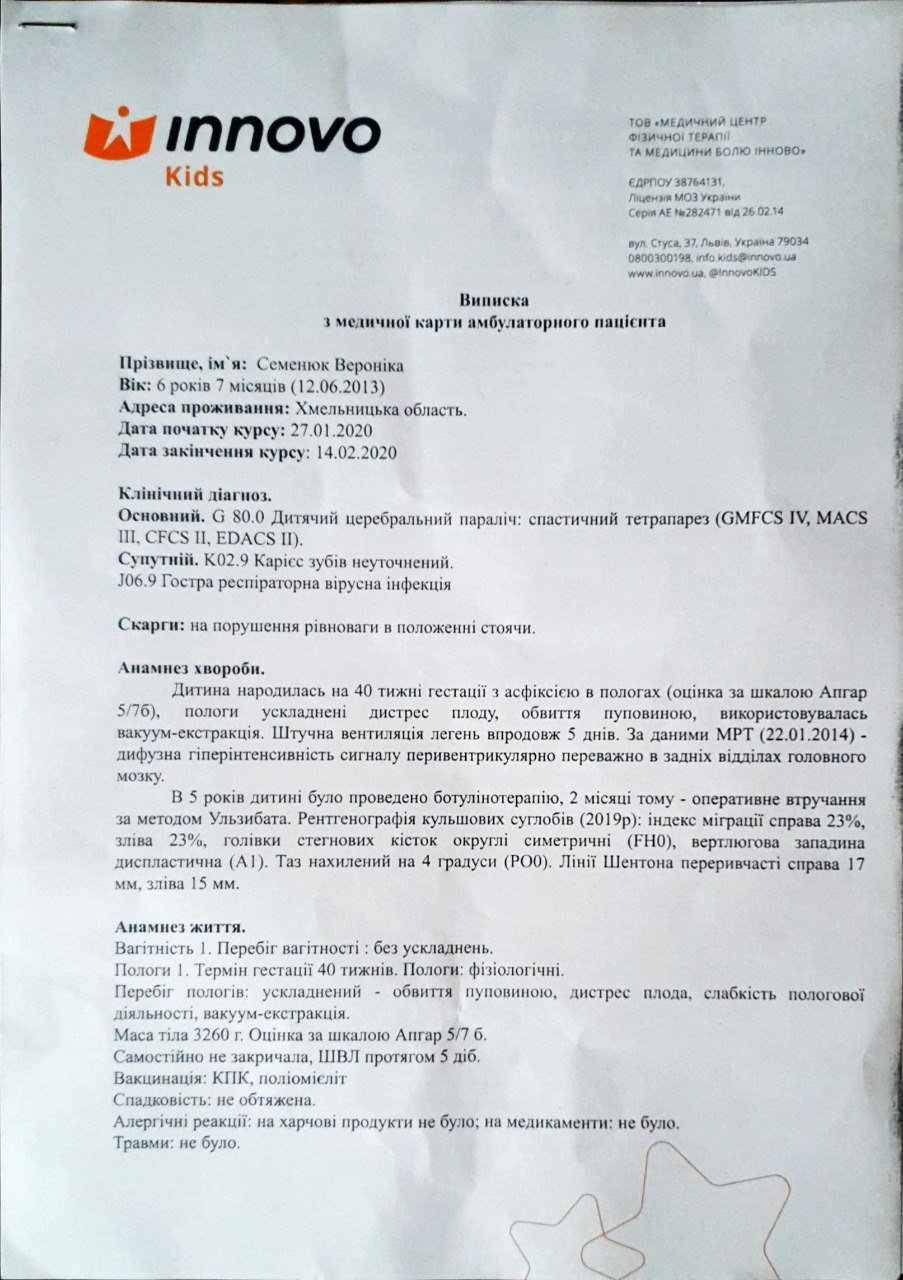 До нашого фонду звернулась мама Семенюк Віроніка Юріївни. 12.06.2013 року народження. Ще в два місяці їй поставили страшний діагноз: «ДЦП спастичний тетрапорез». Дівчинка постійно лікується та проходить курси реабілітації. Віронічці дуже повезло, бо цього літа до нашої країни прилетить ізраїльський хірург Амір Кершанович. Він проведе для шістьох українських дітей операції. Наша Віронічка потрапила до цього списку. Після операції прогнози дуже гарні, Віроніка зможе ходити. Вона так про це мріє!!!!