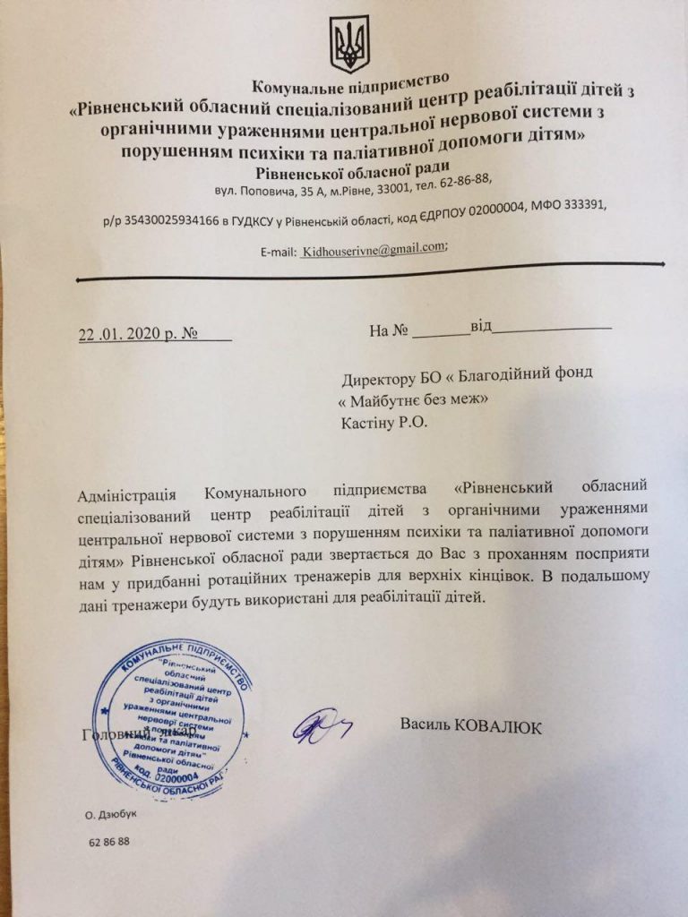 Отримали листа-прохання щодо закупки ротаційних тренажерів для верхніх кінцівок від “Рівненського обласного спеціалізованого центру реабілітації дітей з органічними ураженнями центральної нервової системи з порушенням психіки та паліативної допомоги дітям”. Тренажери були передані Центру реабілітації 03 березня 2020 р.